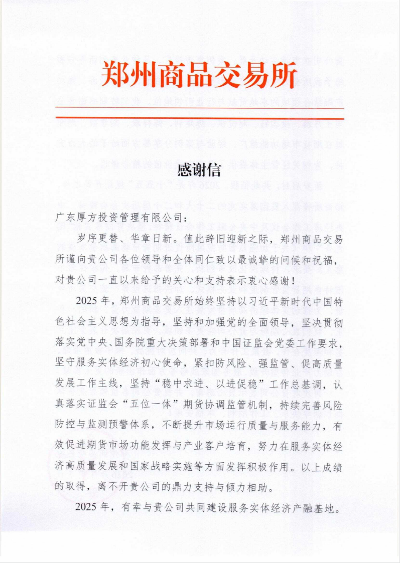 郑州商品交易所向广东厚方投资发来感谢信