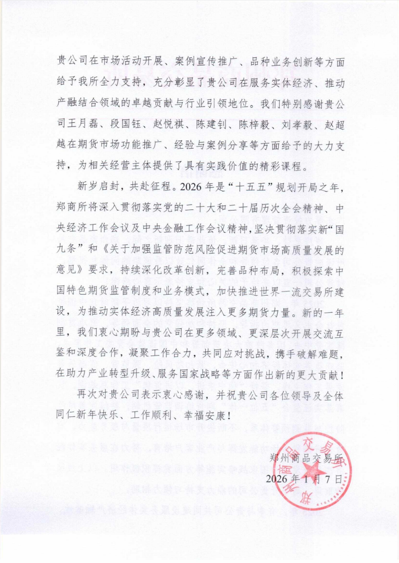 近日,广东厚方投资管理有限公司收到郑州商品交易所感谢信。在信中,郑商所对厚方投资长期以来的支持致以诚挚谢意,肯定了双方在 2025 年共建服务实体经济产融基地的成果,认可厚方投资在市场活动、案例推广、业务创新等方面的鼎力相助及行业引领地位,祝贺厚方投资在郑商所2025年度产融基地评选中成功获评“特色型”产融基地。郑商所特别感谢了公司王月磊等七位同仁在期货市场功能推广、经验分享等方面的突出贡献。